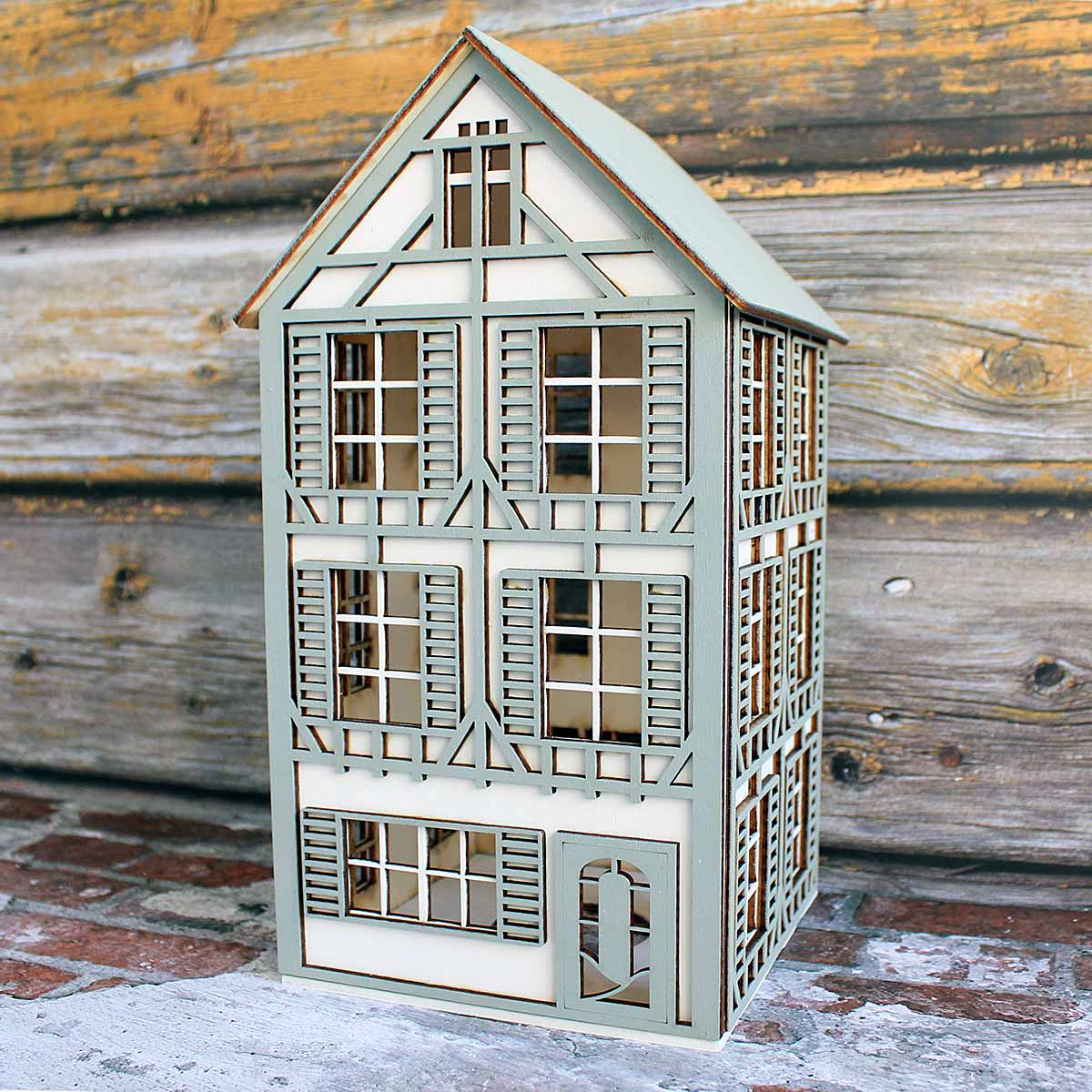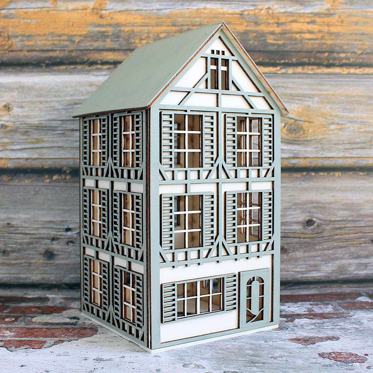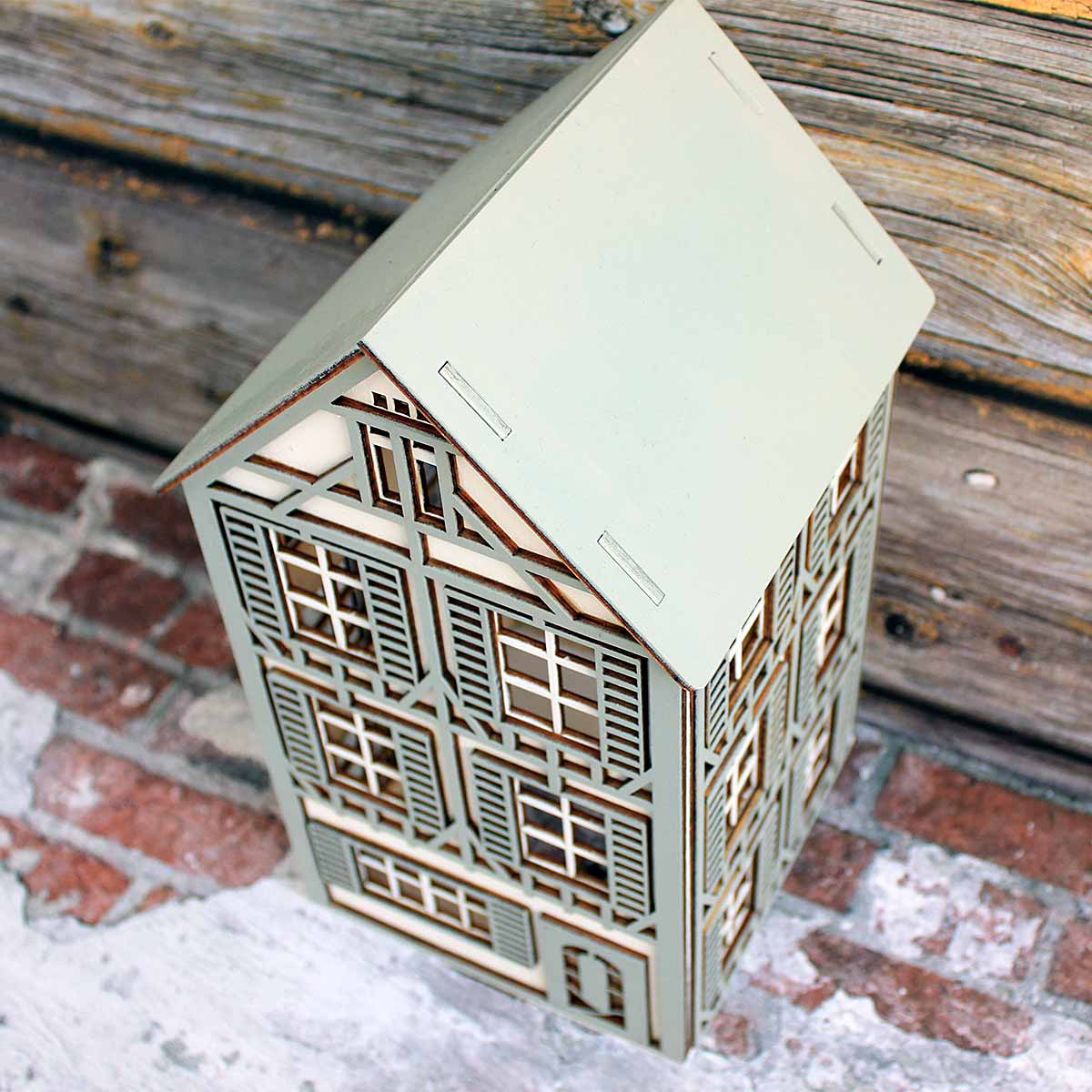 Beautiful wooden lantern in the shape of a house made of wood – plywood. Hand dyed and colored. Insert a lit electric candle and let the lantern be filled with a pleasant light! The lantern can be built as a decoration for furniture or freely on the floor.