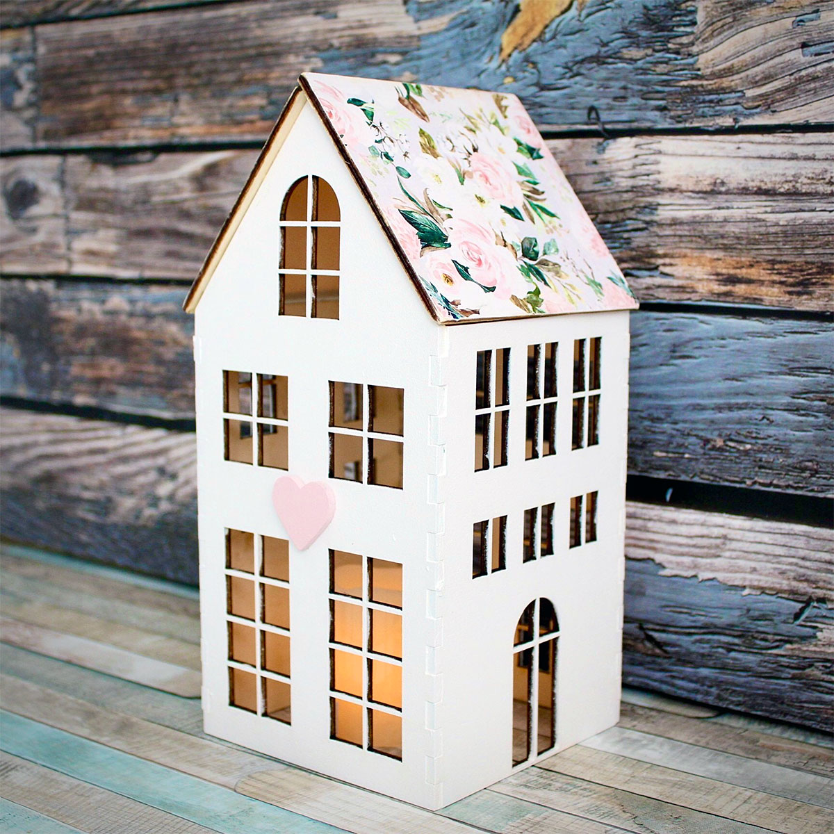 Beautiful wooden lantern in the shape of a house made of wood – plywood. Hand dyed and colored. Insert a lit electric candle and let the lantern be filled with a pleasant light! The lantern can be built as a decoration for furniture or freely on the floor.