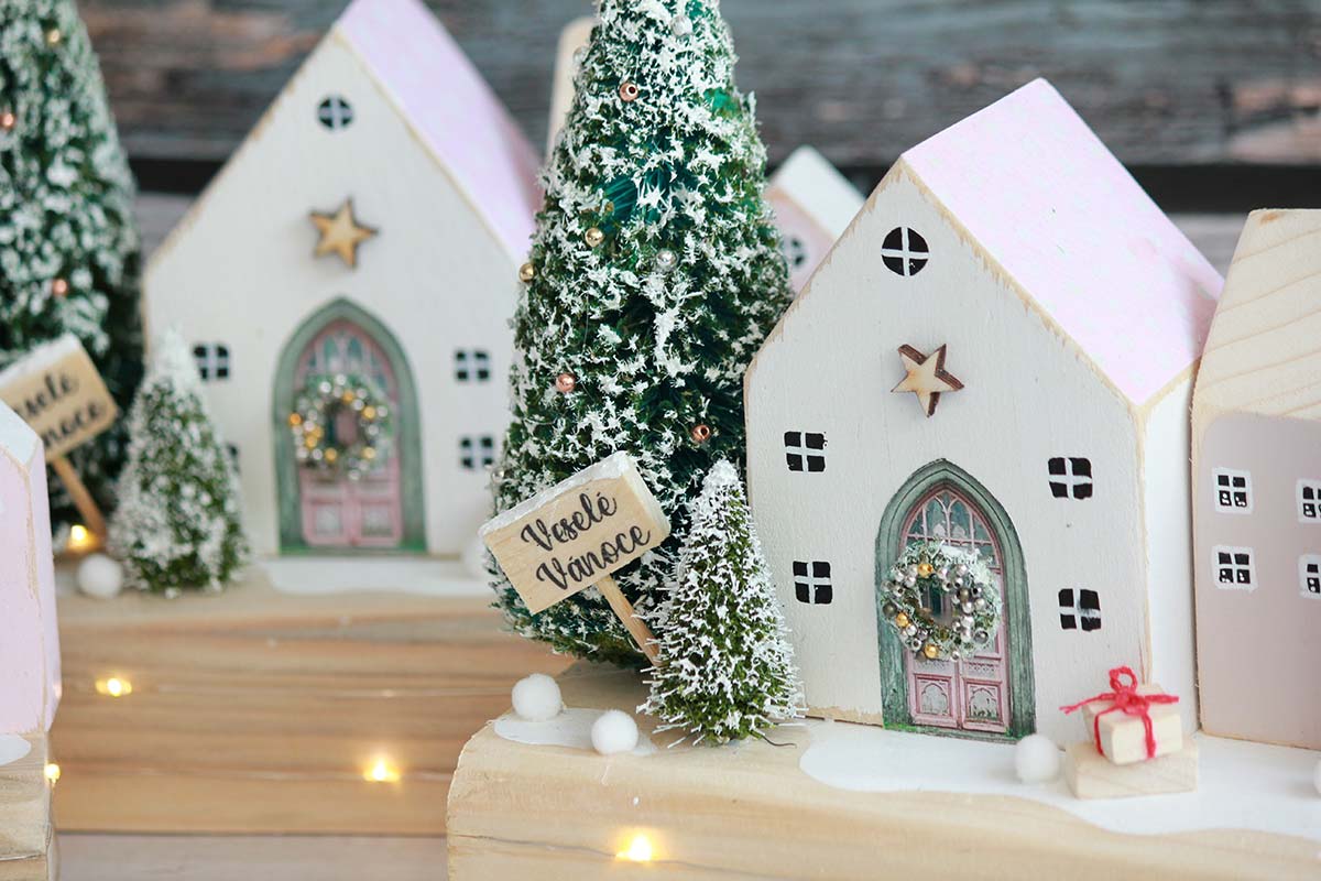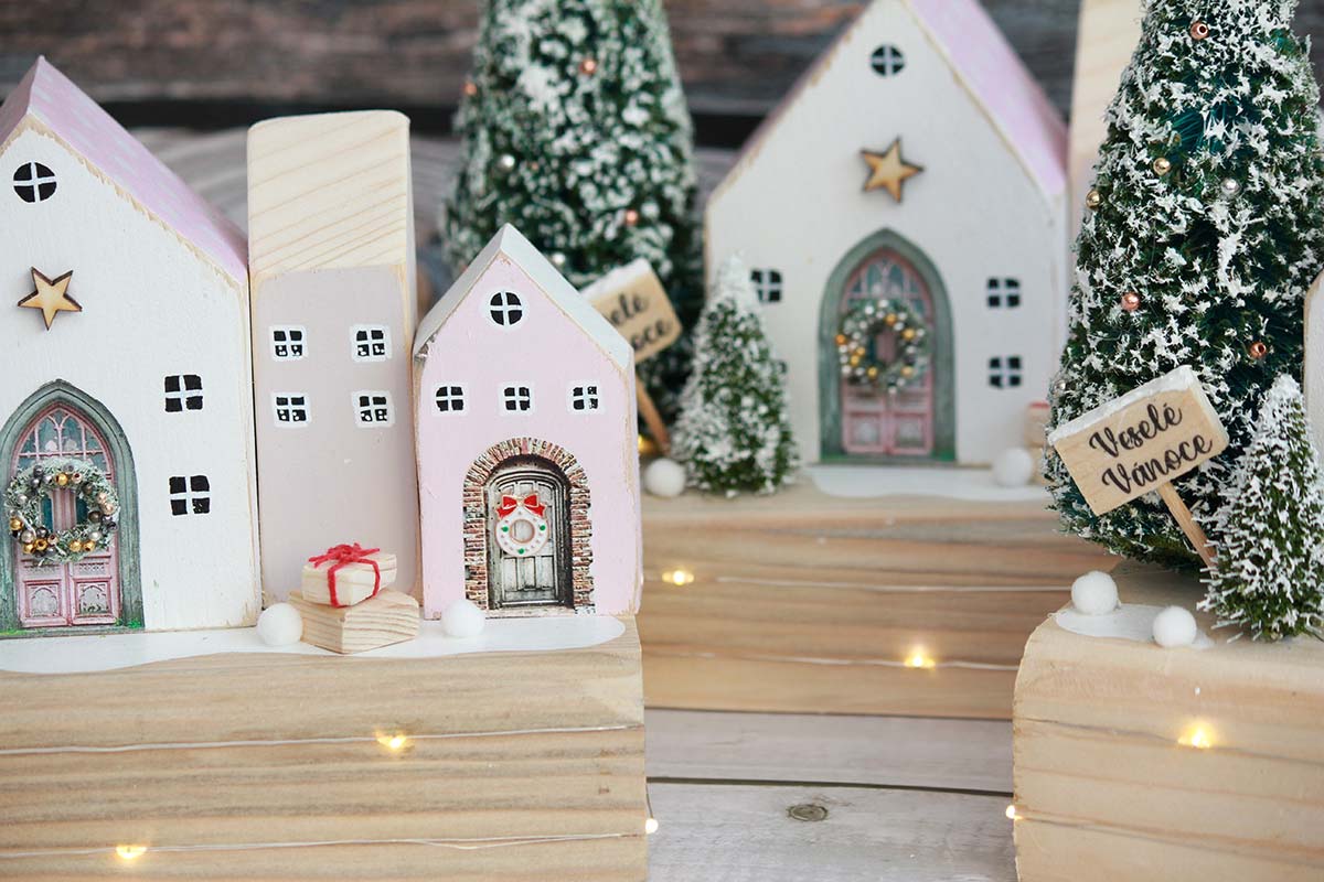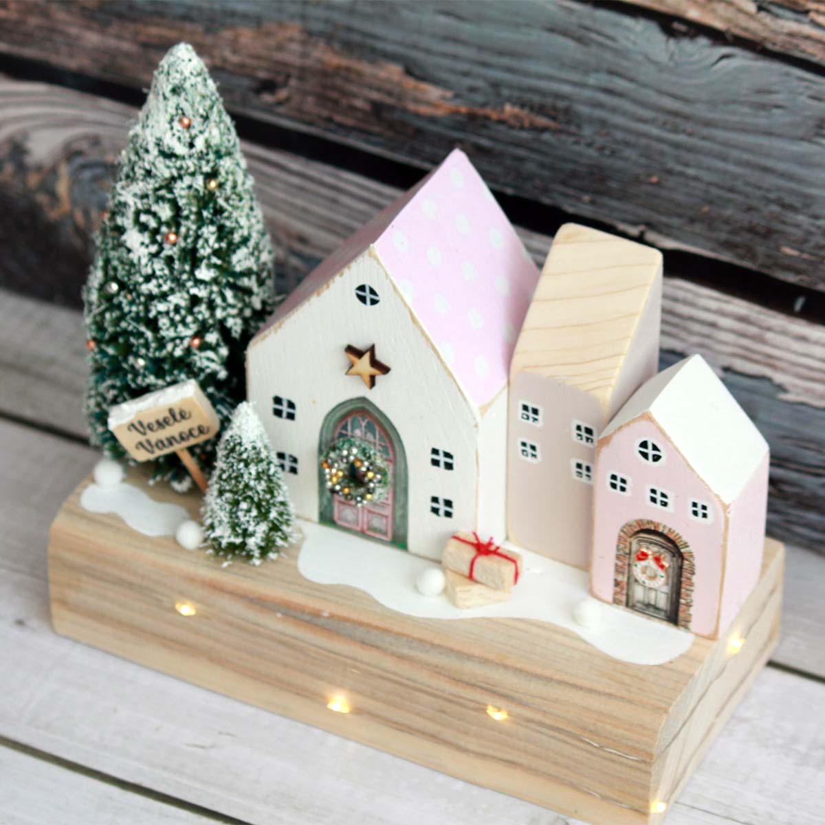 A beautiful set of decorative houses with lights, everything is handmade from our workshop. The houses are made of solid wood and hand decorated and painted.