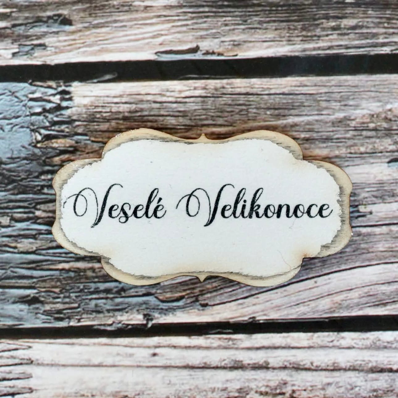 Vyřezávaná cedulka z překližky o šířce 4 mm s nápisem “veselé Velikonoce ” s patinou , vhodná jako přízdoba  do velikonočních a jarních věnců a dekorací .