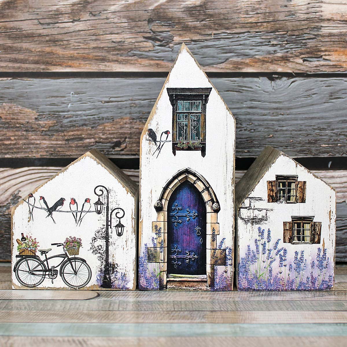 Krásná sada dekorativních domečků, vše je ruční výroba z naší dílny. Domečky jsou vyrobeny z masivního dřeva a ručně dekorované a malované.
